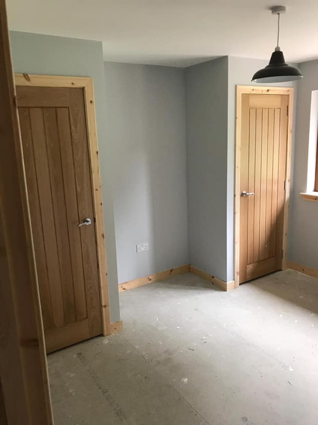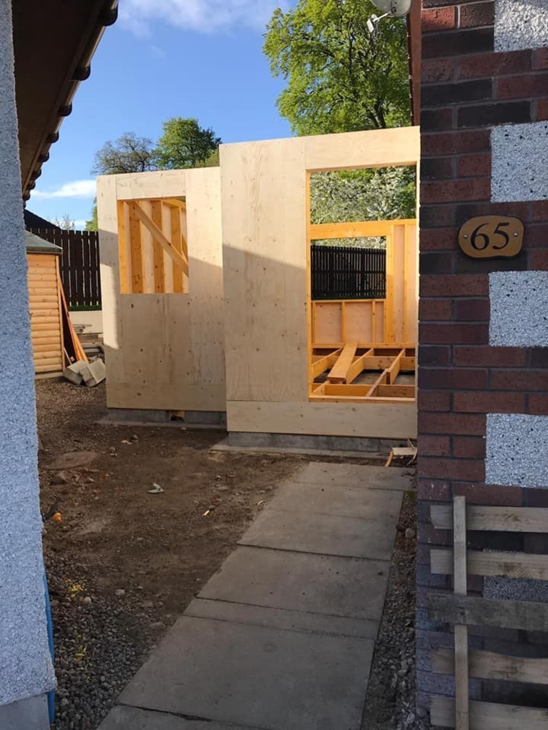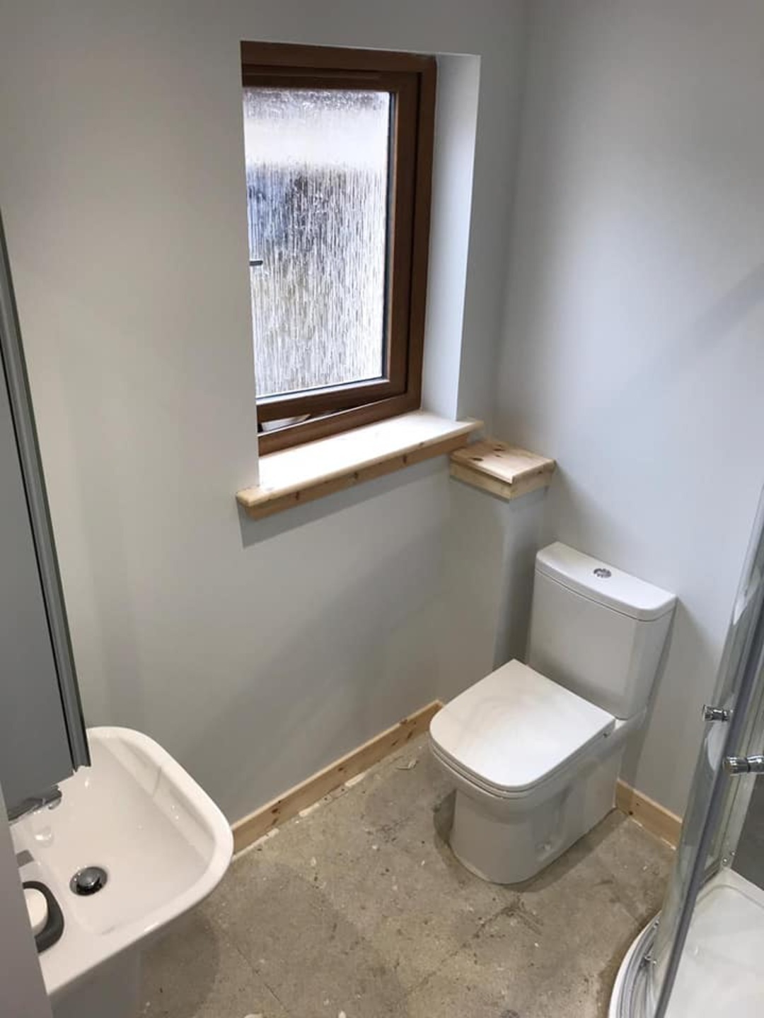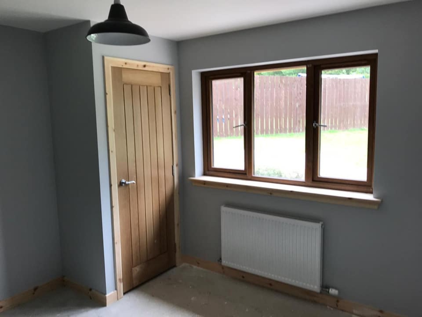 New extension to house - bedroom with built in cupboards and ensuite bathroom. Also new windows and back door fitted to existing house.