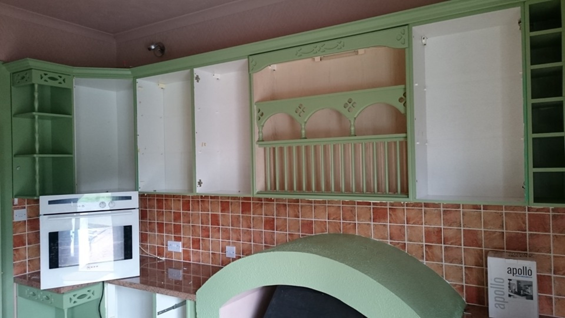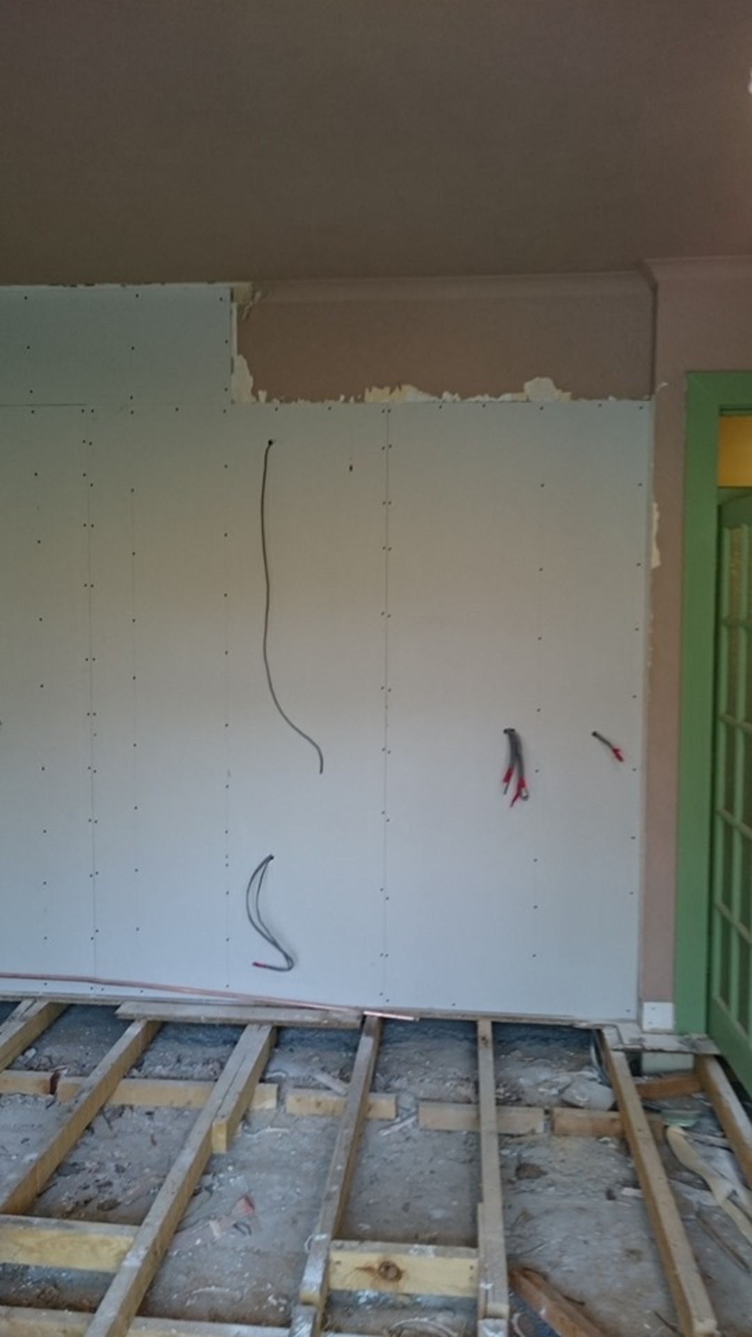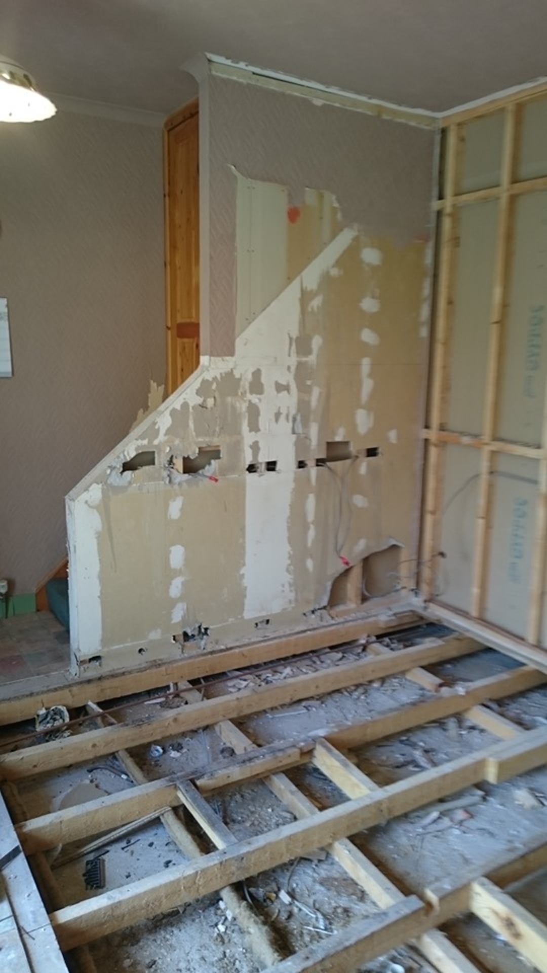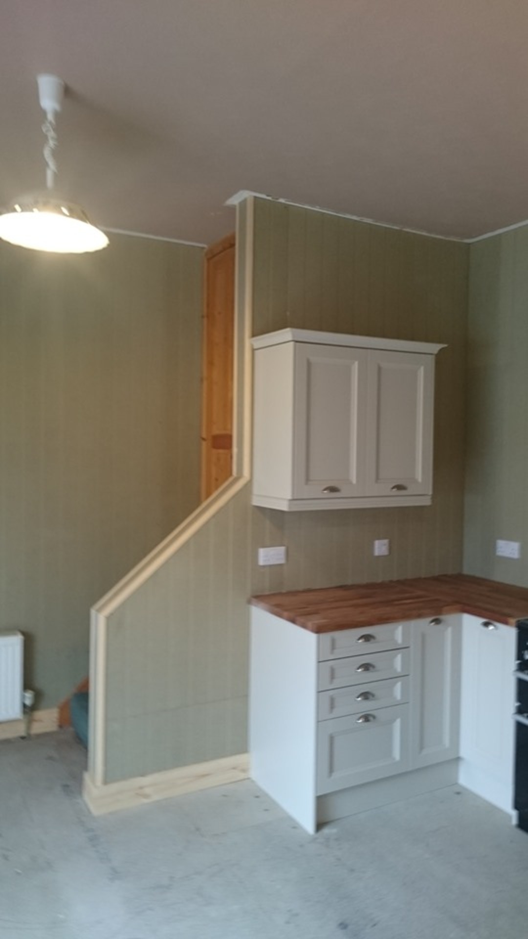 Removed old kitchen and old fire to begin with then re-plaster boarded the walls and fitted them with mdf V- lining panels. Lifted up flooring, fitted new insulation and laid new chipboard floor before completing the job with the installation of the new kitchen